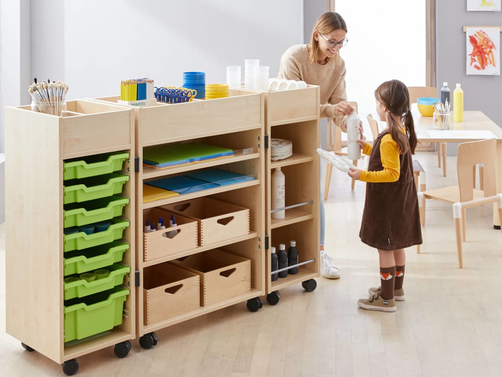Kreativraum gestalten in der Kita heißt auch: Die Ordnung nicht aus dem Blick verlieren. Wenn praktische Verstaumöglichkeiten im Materialschrank oder mit dem Papierfächerregal Schnippelmaxe an der Wand vorhanden sind, können Kreativprojekte schnell und ohne viel Aufwand gestartet werden. Neue Kunstwerke können platzsparend in fahrbaren Trockenwägen verstaut werden. Dabei lernen die Kinder, wo alles hingehört, und der Kreativbereich ist innerhalb kürzester aufgeräumt, wenn neue Aktivitäten anstehen.