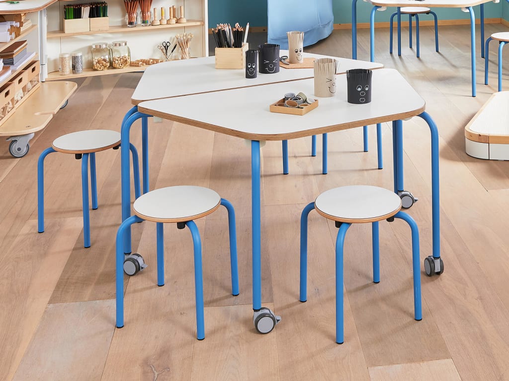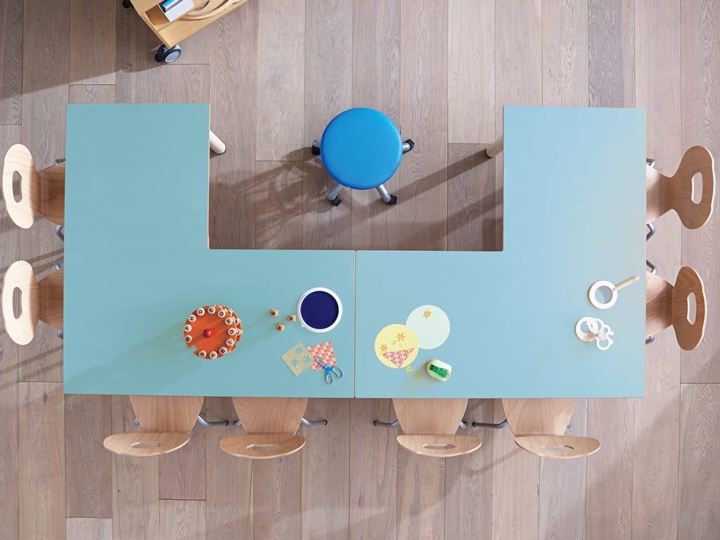 Wenn Kinder gerade mitten in ein Bastelprojekt vertieft sind, können laute Geräusche besonders störend sein. Sorgen Sie mit Tischen mit Linoleumbelag dafür, dass sie nicht aus ihrer kreativen Phase gerissen werden. Die Beschichtung aus Linoleum sorgt dafür, dass Scheren, Stifte & Co. auf den Tischen weniger laut klappern als andere. Die Tische senken den Lärmpegel im Raum, was auch für die Fachkräfte entlastend sein kann. Daneben können Sie Schallabsorber oder Akustiktrennwände für einen optimalen Schallschutz im Kreativraum einsetzen.