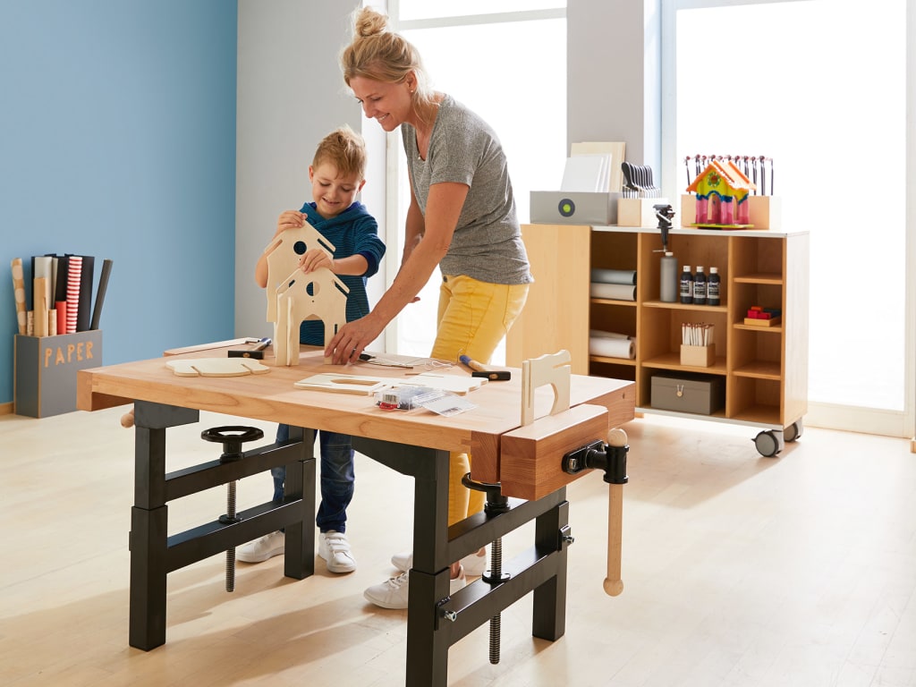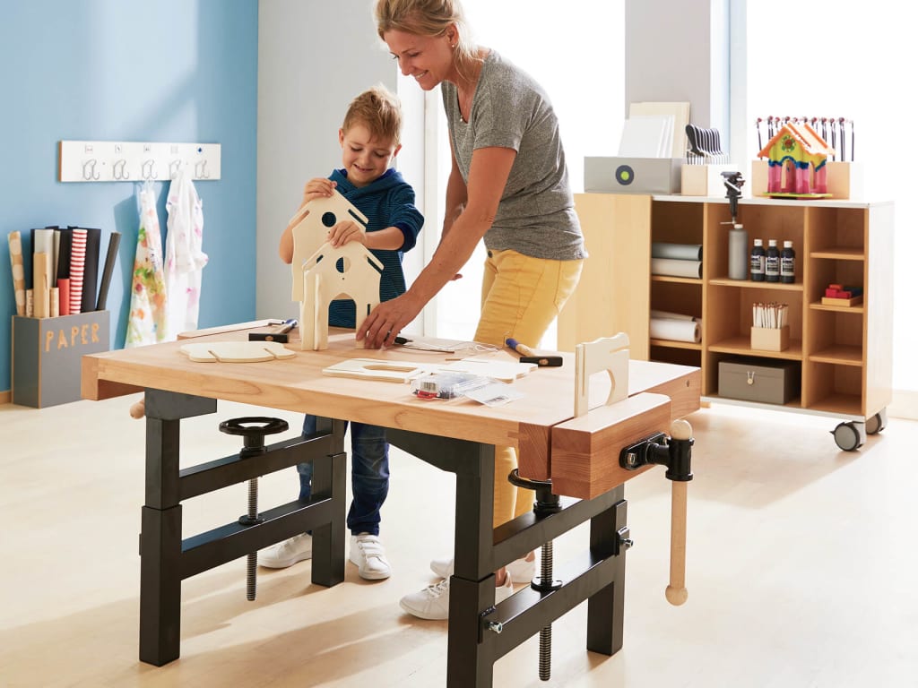 Im separaten Kreativraum finden Kinder beste Voraussetzungen vor, um ungestört an ihren Ideen zu arbeiten. Den Kindern sollte hier ein großer Tisch zur Verfügung stehen, der genügend Platz bietet, um mit unterschiedlichsten Bastelmaterialien zu hantieren. Als Sitzgelegenheiten können Stühle oder Hocker genutzt werden. Lern- und Kreativmöbel, wie fest installierte Staffeleien, Malwände oder höhenverstellbare Werkbänke bieten den kleinen Kreativen viel Raum, um ihrer Fantasie zu jeder Zeit freien Lauf zu lassen.