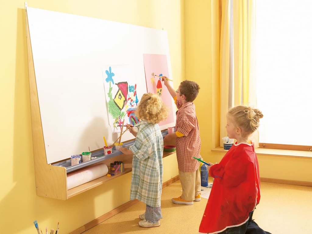 Tipp: Wenn ein Kreativraum in Ihrem Kindergarten oder Ihrer Kita nicht vorhanden ist und der Gruppenraum keinen Platz bietet, können Sie mobile Staffeleien zum Beispiel in den Waschraum stellen. Schon wird aus dem Waschraum eine Wasserwerkstatt mit bunten Kunstwerken der Kita-Kinder!