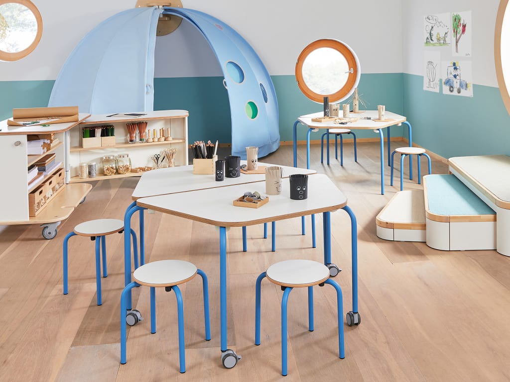Im geschlossenen Kita-Konzept ist der Kreativbereich Teil des Gruppenraums. Die Kids verwirklichen ihre Bastelprojekte am Tisch des Gruppenraums, der auch für viele andere Aktivitäten, vom Puzzeln, über das gemeinsame Essen bis hin zum Geschichtenerzählen, genutzt wird. Flexibilität ist hier der Schlüssel, um in diesem multifunktionalen Raum eine Kreativecke für die Kinder zu schaffen.